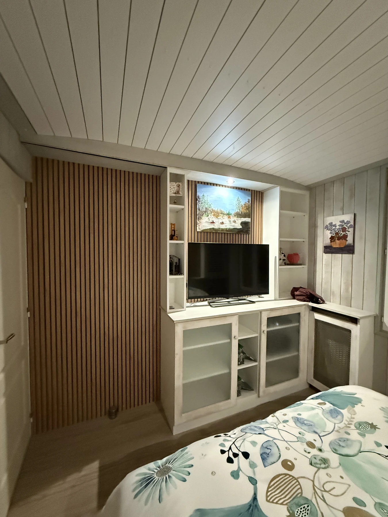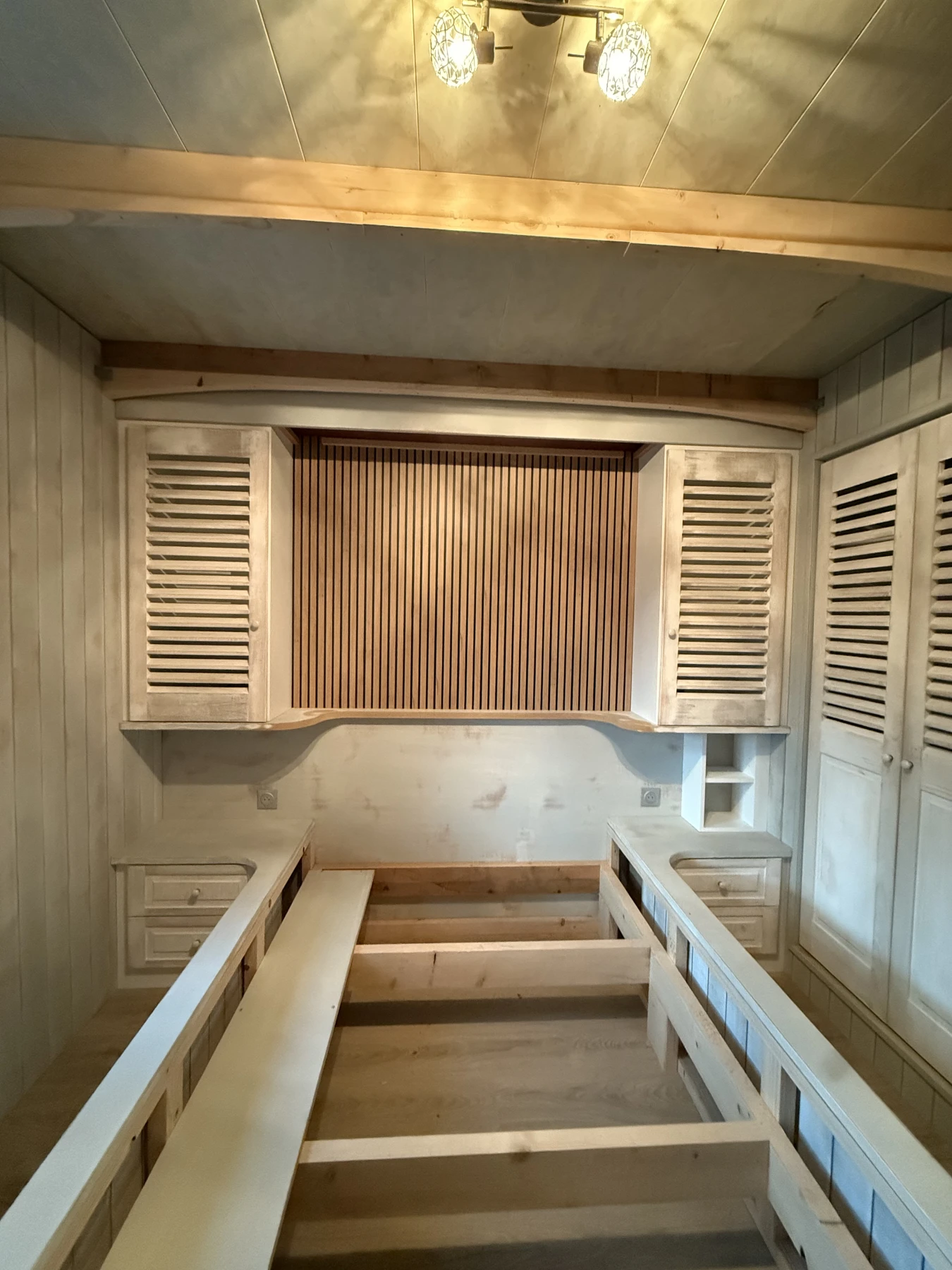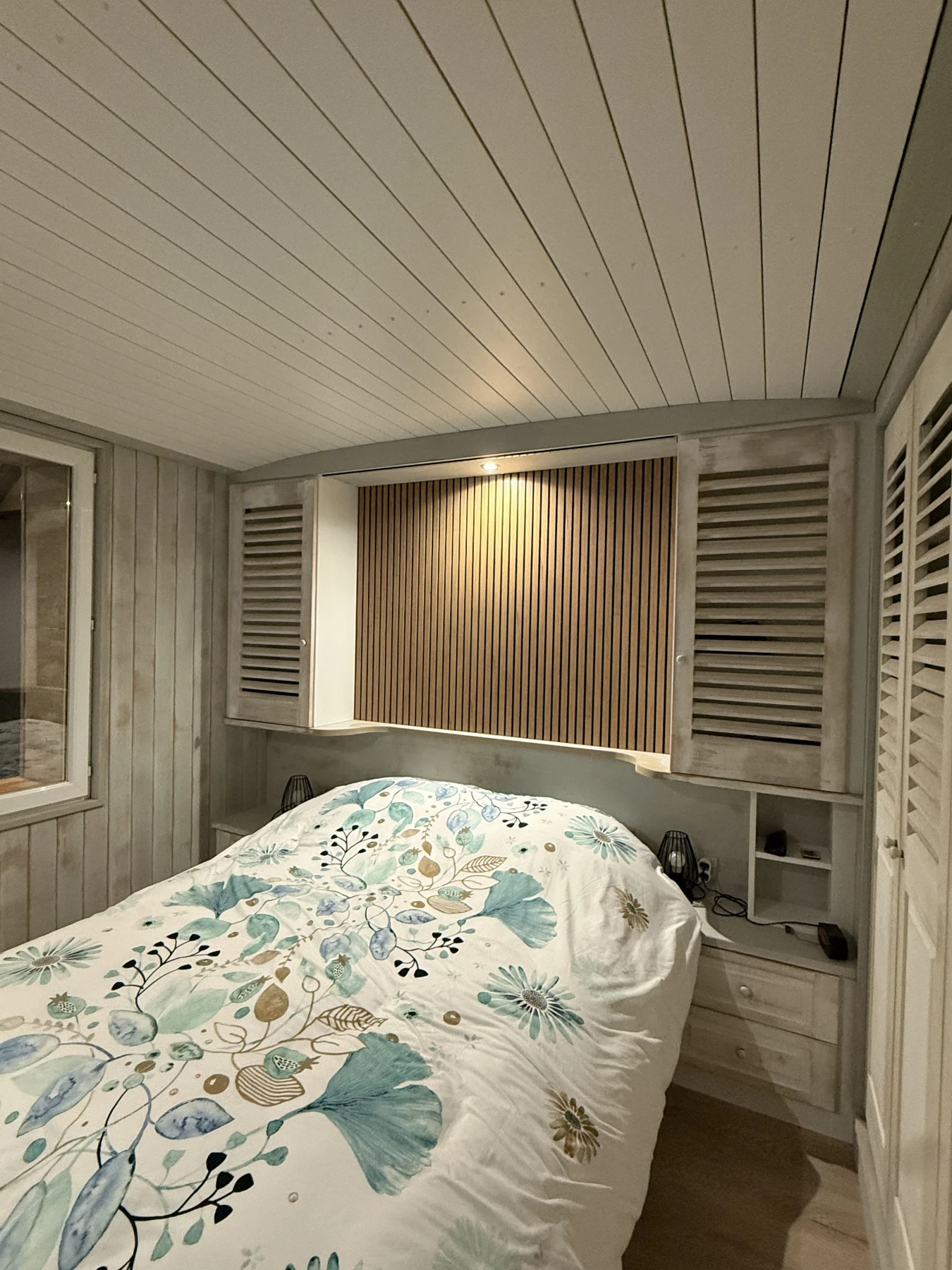 Grâce à des choix esthétiques et techniques soigneusement étudiés — placard à portes persiennes, plafond arrondi et mur en tasseaux — cette pièce gagne en caractère, en profondeur et en confort.