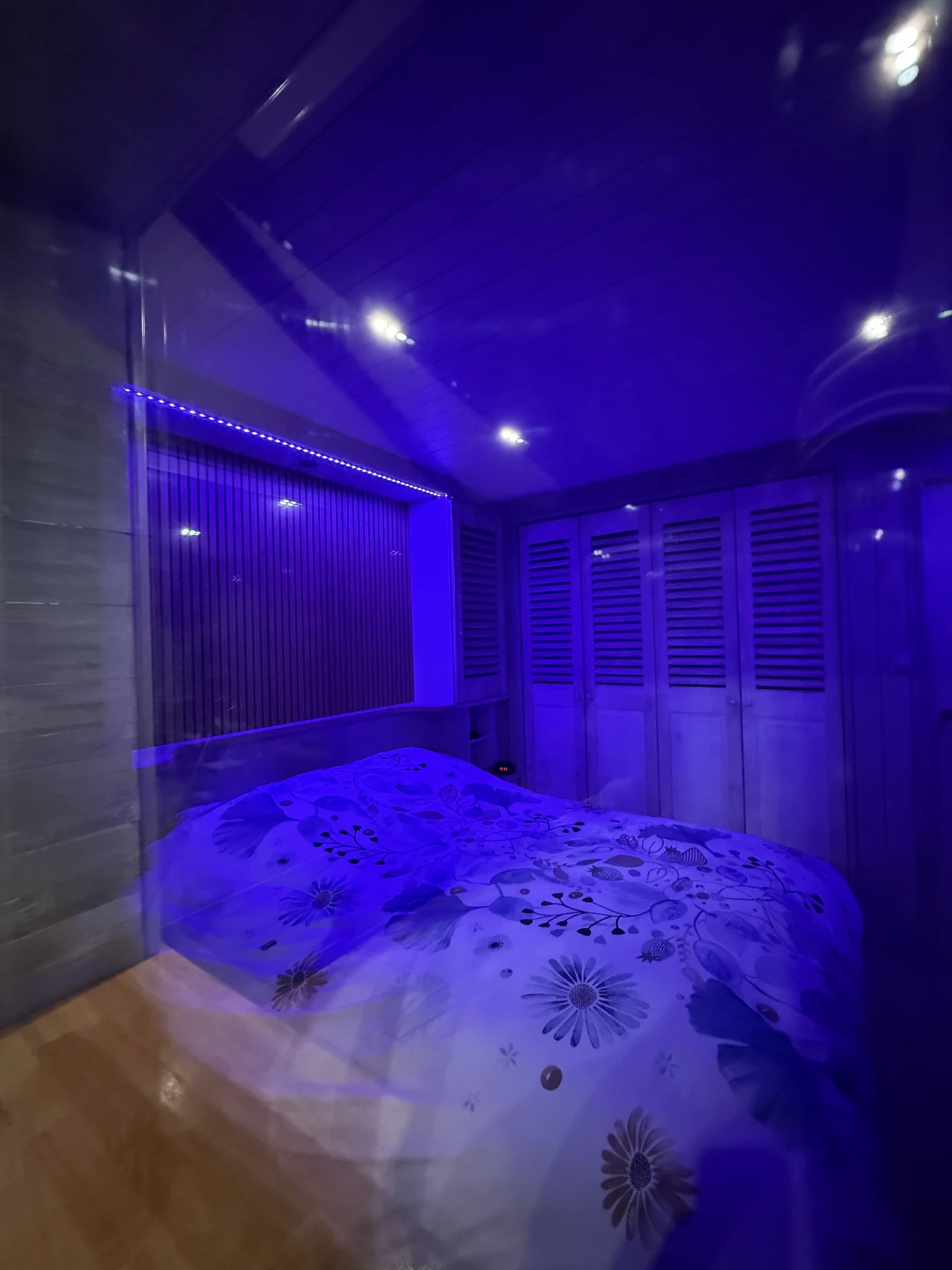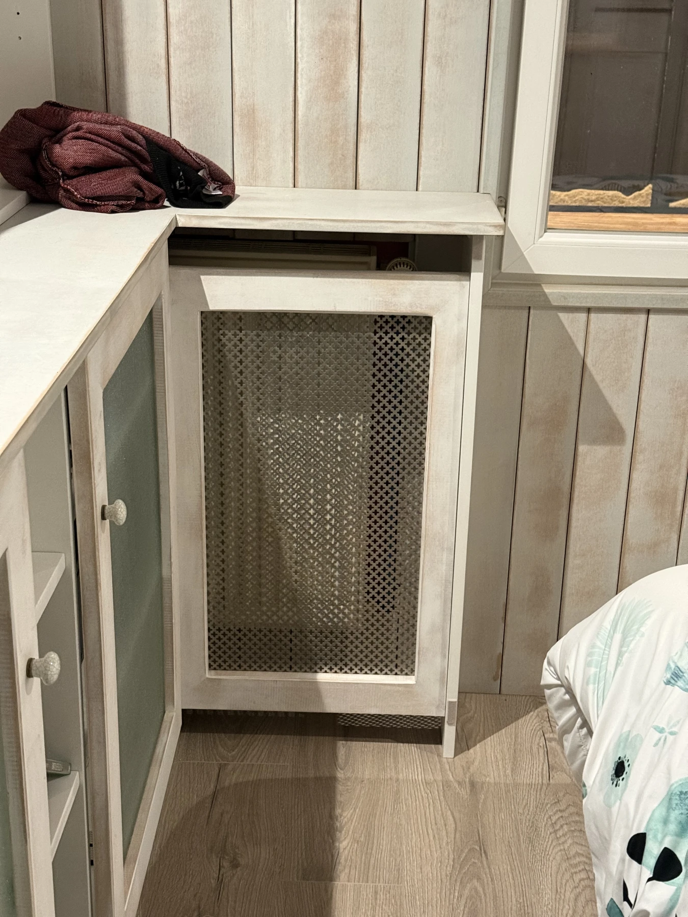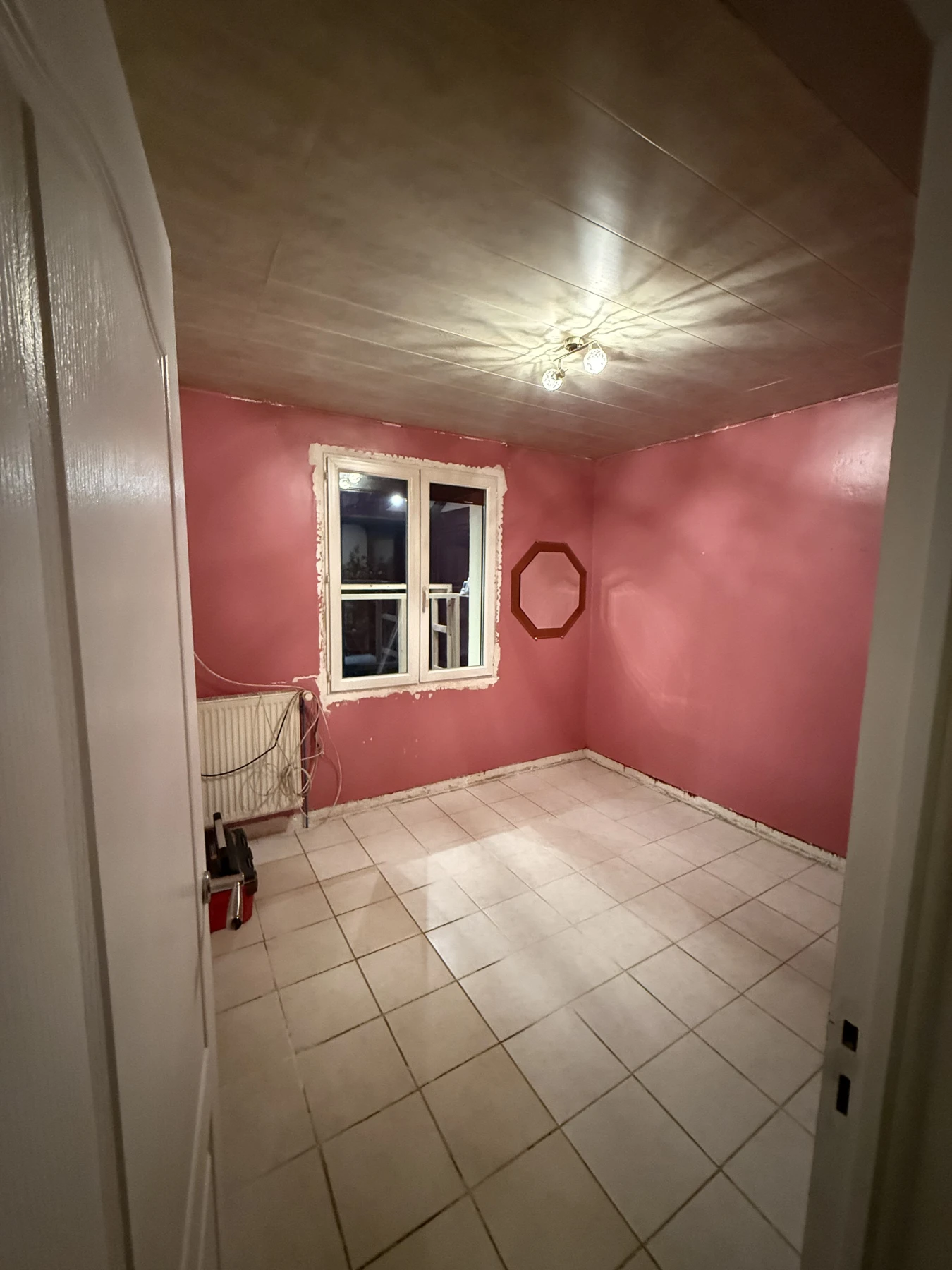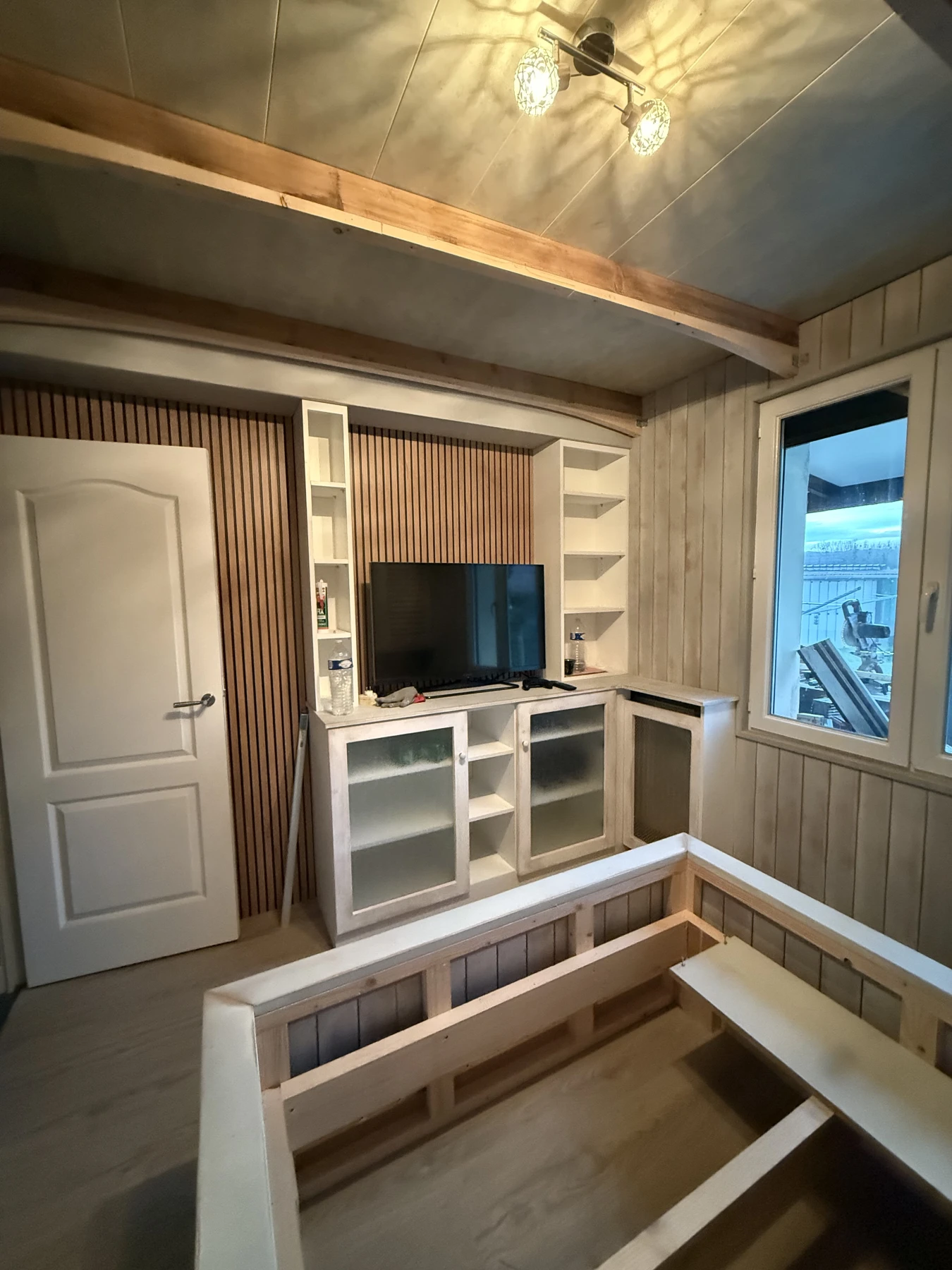 Grâce à des choix esthétiques et techniques soigneusement étudiés — placard à portes persiennes, plafond arrondi et mur en tasseaux — cette pièce gagne en caractère, en profondeur et en confort.